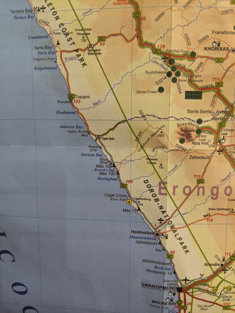 • The C34 south from Torra Bay to Swakopmund is very smooth. The road is a mix of gravel and salt, depending on the underlying terrain. The road becomes tarred just North of Henties Bay and appears to be quite new.
